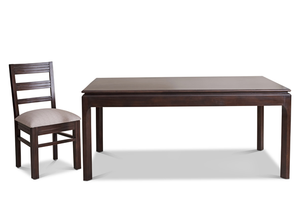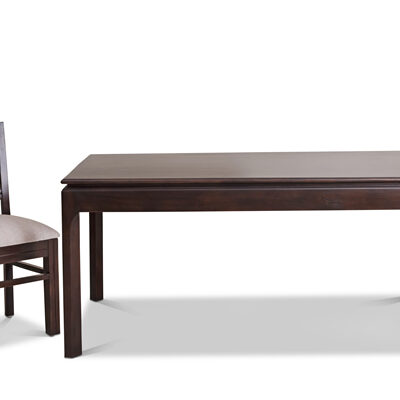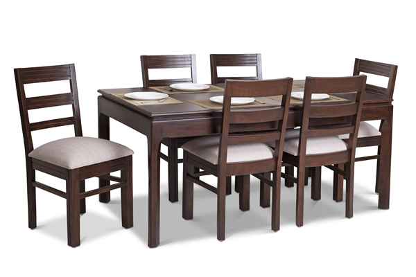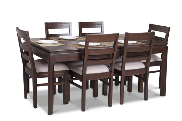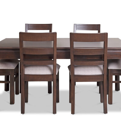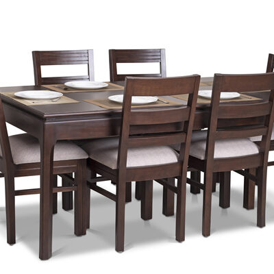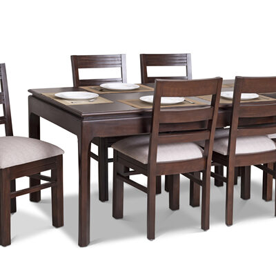 6 seater dining table in teakwood and teakboard top duly matt finished. Sleek teakwood dining chairs in matt finish and seat upholstered in quality fabirc and high density cushion. Available in walnut matt and light walnut finish.