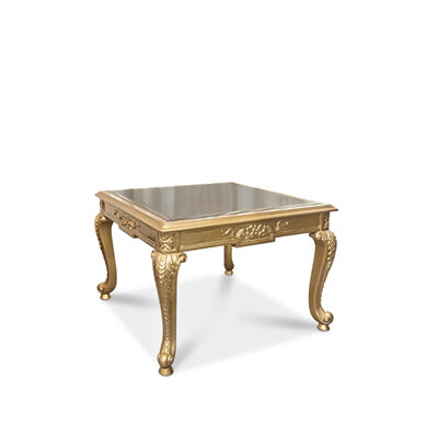 Oriental center table with glass top fully in teakwood, golden finish with PU coating.